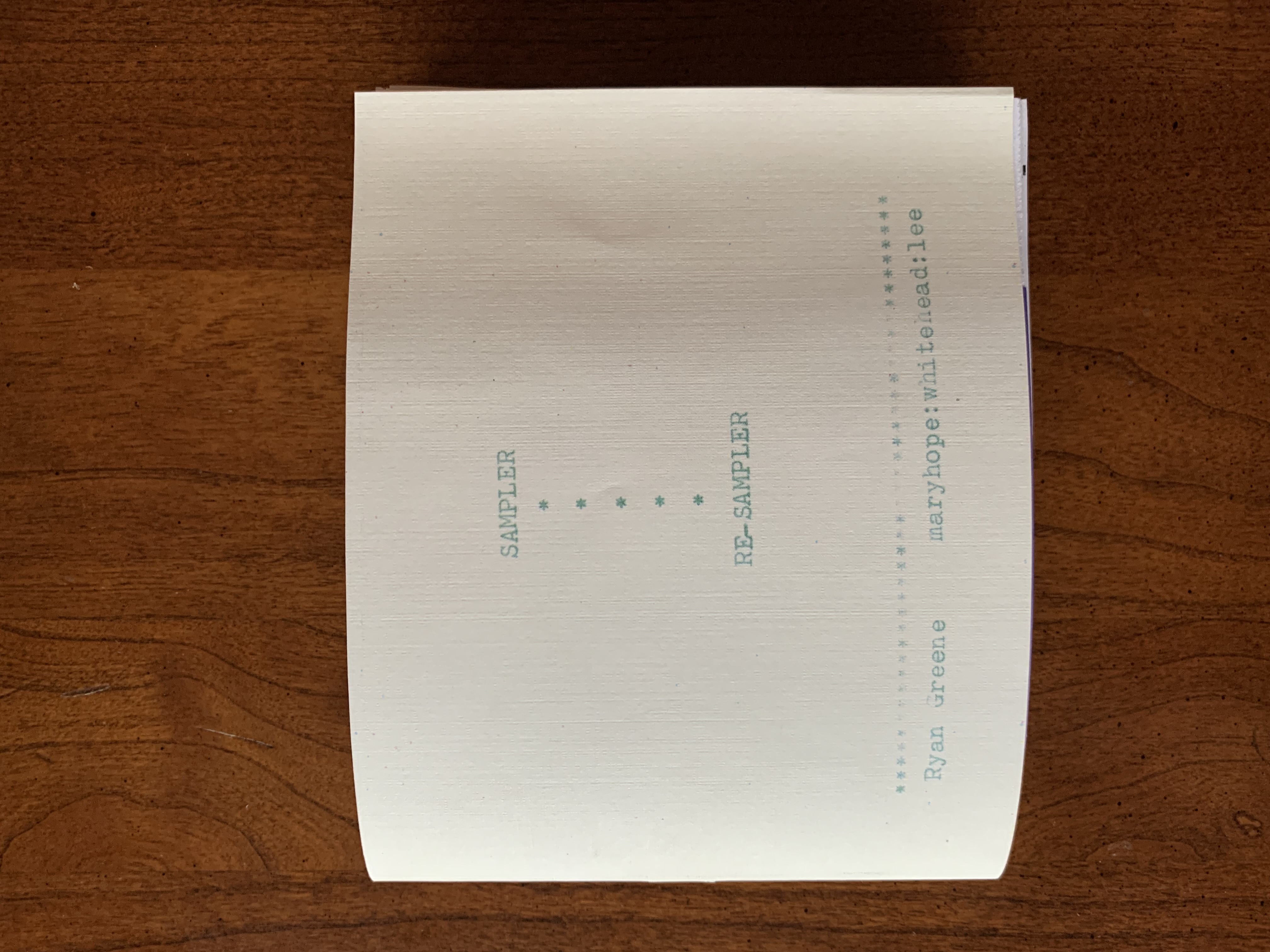 sampler + re-sampler is a co-dive into ecstatic ekphrasis, less interested in description or captioning, instead edging toward collaged text written in celebration of image, memory, and deep friendship. it is the [ongoing] result of a collaboration that began [unknowingly] with the re-publication of maryhope|whitehead|lee’s book Nuclear Waste [F*%K IF I KNOW//BOOKS, 2019] as a zine in the early months of 2021. given the dimensions we used for the re-formatted zine version, we needed to trim a slim bit of blank space at the bottom of the folded pages. the result: a 5.5”x1.5” booklet that we began to think of as the “waste” of Nuclear Waste. copies of Nuclear Waste are available here.